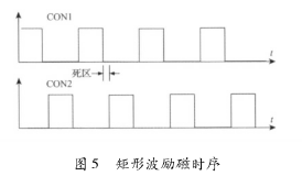 該電路主要由勵磁時序發(fā)生單元、三態(tài)緩沖器及隔離光耦組成。勵磁時序由水箱排水流量計(jì)系統(tǒng)的控制核心產(chǎn)生。采用DSP的EPWM外設(shè)模塊,通過設(shè)定其內(nèi)部定時器的工作模式發(fā)出所要求的勵磁頻率的勵磁時序PWM信號CT_1和CT_2。由于勵磁控制系統(tǒng)中的勵磁工作電源的電壓要比DSP的工作電源電壓高得多,為防止勵磁電路故障對系統(tǒng)控制核心產(chǎn)生致命影響,采用光耦將控制部分與勵磁部分進(jìn)行隔離。另外,由于DSP引腳的驅(qū)動能力有限,所以在DSP與隔離光耦之間加入三態(tài)緩沖器以驅(qū)動隔離光耦的輸入級。并且,DSP能夠通過GPIO口控制三態(tài)緩沖器上的使能引腳來使能和禁止勵磁,以在檢測到電路故障時迅速關(guān)斷H橋所有橋臂。該勵磁時序產(chǎn)生電路通過軟件編程可產(chǎn)生如圖5所示的單頻矩形波。在實(shí)際應(yīng)用中,由于組成H橋的達(dá)林頓三*管與MOS管導(dǎo)通與關(guān)斷的時間不一致,易在勵磁方向切換瞬間,產(chǎn)生上下橋臂同時導(dǎo)通的現(xiàn)象,反映在勵磁電流波形上為一幅值很高的窄脈沖。該脈沖電流不僅容易引起遲滯比較電路的誤輸出,從而導(dǎo)致高低壓切換電路與電流旁路電路的誤動作,而且對恒流控制電路產(chǎn)生沖擊,減小三端穩(wěn)壓芯片的使用壽命,同時還會產(chǎn)生EMC電磁干擾,給測量精度帶來影響。所以實(shí)際應(yīng)用時,如圖5所示對方波勵磁時序添加死區(qū),可以明顯減小上述現(xiàn)象。