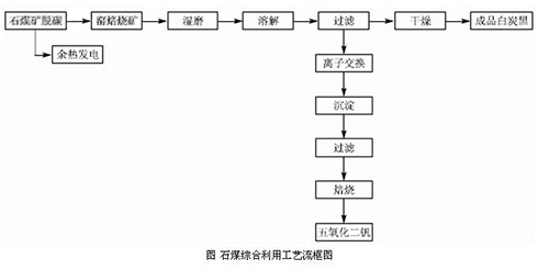本項目為石煤綜合利用的項目。現(xiàn)有提釩工藝產生大量廢渣。其主要成分為二氧化硅,但其中夾帶有大量的釩資源,釩資源利用率低,同時,該廢渣中堿含量較高,如將廢渣隨意堆放,易造成環(huán)境污染。本項目*大特點在于利用現(xiàn)有提釩工藝中的提釩二次渣作為制備沉淀法白炭黑的主要原料,將廢渣中的硅資源得到充分利用。為企業(yè)創(chuàng)造了新的經(jīng)濟增長點,同時,解決了現(xiàn)有提釩生產中造成的釩資源浪費和環(huán)境污染問題,此外,該項目利用現(xiàn)有提釩生產線脫碳工序中產生的余熱作為加熱熱源,取代了傳統(tǒng)工藝以煙煤為主要燃料的方法,即對生產中產生的余熱得到了有效合理的利用,又進一步降低了產生的燃料成本,達到了節(jié)能減排,資源綜合利用的目的,工藝流程框圖如下。
