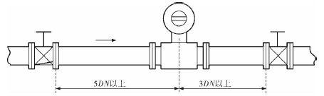 衛(wèi)生型卡箍電磁流量計的安裝質(zhì)量對其測量結(jié)果的影響較大,因此在安裝時需要注意幾個問題。*先,衛(wèi)生型卡箍電磁流量計直管段的選擇在配管時一定要按照要求進行選擇,一般選擇流量計通徑與工藝管道通徑相同,即可滿足工程需要,而且安裝方便、壓力損失小,流量計直管段上游側(cè)的長度不少于5倍工藝管道直徑,下游側(cè)的長度不少于3倍工藝管道直徑(圖2)。但在流速太慢而又要求精度較高或需要變徑的應(yīng)用場合,可選擇通徑小于工藝管道通徑的流量計,以提高測量精度,此時流量計上、下游必須加裝異徑管,且進口異徑管上游側(cè)應(yīng)有長于10倍工藝管道直徑的直管段,下游側(cè)應(yīng)有長于5倍工藝管道直徑的直管段(圖3)。