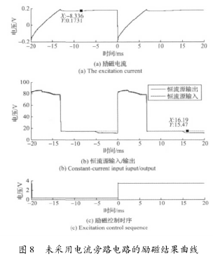 實驗結(jié)果表明,高壓源向低壓源切換后,三端穩(wěn)壓器的工作特性致使的電流波動和低壓源供電情況下的恒流控制,會大幅延長勵磁電流的穩(wěn)態(tài)響應(yīng)時間。圖8所示勵磁電流約在17ms左右進入穩(wěn)態(tài),圖9所示勵磁電流的穩(wěn)態(tài)響應(yīng)時間約為12ms。這表明,在采用三端穩(wěn)壓器搭建恒流控制電路的情況下,電流旁路電路能有效克服三端穩(wěn)壓器工作特性的影響,并能方便的實現(xiàn)電流超調(diào),加快勵磁電流的響應(yīng)速度。