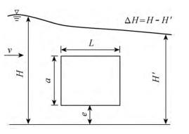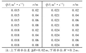 有限水域的浮體結(jié)構(gòu)在不同來流動水中運(yùn)行時,浮體結(jié)構(gòu)位置的改變會對流場產(chǎn)生影響,從而影響浮體結(jié)構(gòu)的泄流能力以及穩(wěn)定性。試驗(yàn)過程中固定浮體結(jié)構(gòu)的體型不變(長L=0.20m,寬B=0.30m,高a=0.10m),分別選取4種不同來流流量Q及浮體結(jié)構(gòu)位置e,控制浮體結(jié)構(gòu)在上、下游水位不變的條件下進(jìn)行試驗(yàn),具體試驗(yàn)參數(shù)設(shè)計(jì)及說明見表1以及圖2。