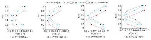 圖4橫坐標(biāo)為斷面水流方向流速,縱坐標(biāo)為測點(diǎn)垂向位置與下游水位的比值y/H'。隨著浮體結(jié)構(gòu)位置的上升,*小斷面流速位置同樣上升。以圖3(a)為例,當(dāng)e=0.02m時,下游斷面位置自下而上呈現(xiàn)先減小、后增大的趨勢,在y/H'=0.40時流速達(dá)到*小,隨著浮體結(jié)構(gòu)位置的上升,*小流速呈現(xiàn)向上偏移的趨勢。在斷面位置y/H'=0.20時,隨著e的增大,流速呈現(xiàn)增大的趨勢。當(dāng)e較小時,流經(jīng)浮體結(jié)構(gòu)下部進(jìn)行下泄的水流較少,主流出現(xiàn)在浮體結(jié)構(gòu)的上部,且在浮體結(jié)構(gòu)的阻擋作用下出現(xiàn)回流區(qū);隨著e上升,主流偏向浮體結(jié)構(gòu)下部區(qū)域,流速增大。與y/H'=0.20的流速分布正好相反,當(dāng)y/H'=0.80時,流速分布隨著浮體位置的增大而減小。隨著e的增大,通過浮體結(jié)構(gòu)下部泄流的水體增多,主流開始向下偏移。試驗(yàn)過程中,浮體結(jié)構(gòu)處于淹沒狀態(tài),流速的分布隨著浮體位置的改變呈現(xiàn)上大、中小、下大的分布趨勢,在浮體結(jié)構(gòu)下游區(qū)域形成回流區(qū),回流區(qū)的位置隨著浮體結(jié)構(gòu)的上升而上升。