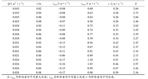 流速沿?cái)嗝娣植嫉木鶆蛱匦钥梢酝ㄟ^流速分布不均勻系數(shù)進(jìn)行表征,通過所選取斷面*大流速和*小流速的差值與該斷面平均流速的比值,δ值越大表明浮體結(jié)構(gòu)的存在對水流斷面流速的分布產(chǎn)生的影響較大。表2中,當(dāng)來流流量相同時,流速的不均勻系數(shù)多數(shù)隨e的增大而減小。浮體結(jié)構(gòu)位置較小時,主流為浮體結(jié)構(gòu)上部的水流。隨著浮體結(jié)構(gòu)位置的上升,來自上游的水體逐漸分成浮體結(jié)構(gòu)上部和下部的兩股主流,流速分布的不均性減小。浮體結(jié)構(gòu)位置及所處水位條件相同時,來流流量的增大,區(qū)域的平均流速增大,因此流速不均勻性減小。