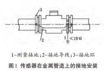 (4) 傳感器安裝在金屬管道上,可將傳感器的接地導線按制造廠的要求連接在2側(cè)管道法蘭上,形成可靠的接地回路(見圖1)。儀表的接地點應是一個獨立的接地點,不允許與其他電氣設備的接地線連接在一起。