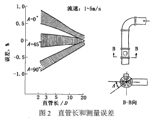 2000年上海原水公司擬在已建成的某泵站加裝DN2200液堿流量表,但彎管下游安裝位置的前直管長度明顯不符合規(guī)定中5D~10D(D為管徑,下同)的要求,此時,影響測量誤差有多大呢?
