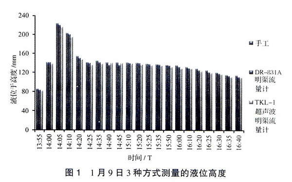 見圖3,以手工實(shí)測液位高度為基準(zhǔn),2種流量計(jì)的誤差均在±5%的范圍內(nèi)。除在1月9日14∶40和14∶45兩個(gè)時(shí)間點(diǎn)測量值表現(xiàn)出DR-831A測量誤差高于TKL-Ⅰ外,其他時(shí)段都明顯表現(xiàn)出DR-831A測量誤差小于TKL-Ⅰ。