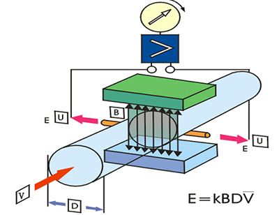 電磁流量計(jì)的工作原理是基于法拉*電磁感應(yīng)定律。在電磁流量計(jì)中,測(cè)量管內(nèi)的導(dǎo)電介質(zhì)相當(dāng)于法拉*試驗(yàn)中的導(dǎo)電金屬桿,上下兩端的兩個(gè)電磁線圈產(chǎn)生恒定磁場(chǎng)。當(dāng)有導(dǎo)電介質(zhì)流過時(shí),則會(huì)產(chǎn)生感應(yīng)電壓。管道內(nèi)部的兩個(gè)電*測(cè)量產(chǎn)生的感應(yīng)電壓。測(cè)量管道通過不導(dǎo)電的內(nèi)襯(橡膠,特氟隆等)實(shí)現(xiàn)與流體和測(cè)量電*的電磁隔離,如圖所示。