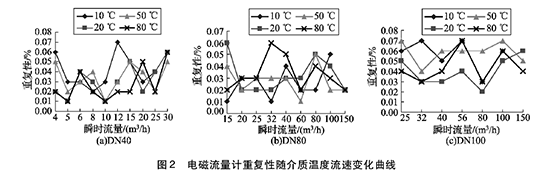 將實驗測得的水泥計量表在不同溫度及流速下的重復性數(shù)據(jù)整理,特性曲線如圖2所示,3組曲線分別對應DN40, DN80, DN100的3塊水泥計量表的重復性曲線。