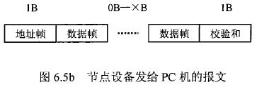 在硫酸流量表等節(jié)點(diǎn)設(shè)備和C機(jī)通信的過程中,由地址幀、命令幀、數(shù)據(jù)幀、校驗(yàn)和可組成各種功能不同的報文。由于采用主從工作方式來實(shí)現(xiàn)通信,硫酸流量表等節(jié)點(diǎn)設(shè)備僅能接收并執(zhí)行PC機(jī)發(fā)送來的控制命令,而不能發(fā)送命令給PC機(jī)。因此,由PC機(jī)發(fā)往流量計等節(jié)點(diǎn)設(shè)備的報文一般包括一個地址幀,一個命令幀,若干個數(shù)據(jù)幀和一個校驗(yàn)和,其報文格式圖.6a5所示;而由流量計等節(jié)點(diǎn)設(shè)備發(fā)往PC機(jī)的報文一般包括一個地址幀,若干個數(shù)據(jù)幀和一個校驗(yàn)和,其報文格式如圖6.5b所示。