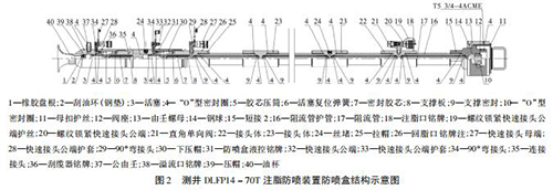 如圖 2 所示,DLFP14 - 70T 注脂防噴盒有 1 個注脂口、1 個回脂口、1 個防噴盒液控口、1 個刮纜器液控口及1 個溢流口,主體內(nèi)裝有 6 根阻流管。DLFP14 - 70T 注脂防噴盒采用 4 級密封: * 1 級密封采用注脂密封,撬裝注脂泵從注脂口注入高壓高粘度密封脂于 6 根阻流管與電纜間隙; * 2 級密封采用液壓密封,氣動液壓泵主加壓和手壓泵補加壓結合從防噴盒液控口注入液壓油,推動活塞擠壓膠芯壓筒; * 3 級密封采用液壓密封,手壓泵加壓從刮纜器液控口注入液壓油,推動活塞擠壓膠芯壓筒實現(xiàn)密封和刮油作用; * 4 級密封油杯、橡膠盤根和刮油環(huán)( 鋼 墊) 。DLFP14 - 70T 注脂防噴裝置配有液控上、下捕捉器、液控雙閘板防噴器和放噴組件,根據(jù)實際可以調(diào)整溢流量,實現(xiàn)零溢流密閉測井施工。 DLFP14 - 70T 注脂防噴裝置工作壓力 70 MPa,耐壓105 MPa。