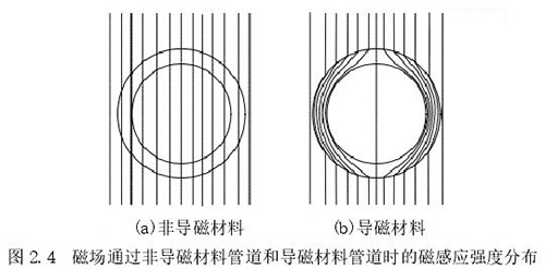 1.測量管:主要是傳感器的管道,該管道由高導(dǎo)電率非導(dǎo)磁材料制成,可保證流體在通過時(shí)能夠表現(xiàn)出自身的電磁效應(yīng),在該管道內(nèi)中安裝了內(nèi)襯。使用非導(dǎo)磁材料的原因是保證勵(lì)磁線圈中所產(chǎn)生的磁場不會(huì)順著管道流走,確保測量管道內(nèi)部產(chǎn)生明顯的磁感應(yīng)線,下圖 2.4 中展示了利用非導(dǎo)磁材料和導(dǎo)磁材料管道中所產(chǎn)生磁感應(yīng)線的情況。