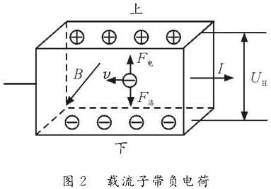 反之,如圖2所示,若載流子帶負電荷,則載流子在洛倫茲力作用下會向下偏轉(zhuǎn),導體下表面積累負電荷。同時,上表面失去負電荷而帶上正電,從而使上表面電勢高于下表面。