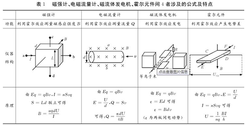 易錯點2:磁強計、工業(yè)污水計量表、磁流體發(fā)電機、霍爾元件間的區(qū)別與聯(lián)系磁強計、工業(yè)污水計量表、磁流體發(fā)電機、霍爾元件都是利用電磁場對帶電粒子的偏轉(zhuǎn)效應,并且穩(wěn)定時電場力與磁場力均達到平衡。很多學生容易將其混淆,遇到問題常常搞不清原理,亂代公式,筆者特將4者涉及的公式及特點等做一對比區(qū)別如表1所示。
