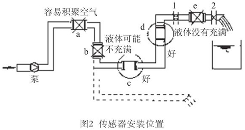 液體流動方向必須與傳感器殼體上箭頭方向一致。對于能正反向測量的生活污水計量表,若方向不一致雖仍可測量,但設定的顯示流動正反方向不符,必須改正之。若拆傳感器工作量大,也可改變傳感器上箭頭方向和重新設定顯示儀表符號。管道未充滿液體主要是管網(wǎng)工程設計或傳感器安裝位置不妥,使傳感器測量管內(nèi)不能充滿液體。應采取措施,避免安裝如圖2所示a,e位置和以虛線管排放時b位置,改裝到c,d位置。