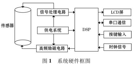 高頻勵磁電鍍污水計量表由傳感器、高頻勵磁電路、信號處理電路等組成,其中高頻勵磁電路決定著傳感器磁場的強(qiáng)弱,勵磁電路的穩(wěn)定性以及精確性決定著系統(tǒng)檢測的準(zhǔn)確性以及穩(wěn)定性。DSP 系統(tǒng)控制勵磁電路激勵傳感器線圈,當(dāng)線圈中有導(dǎo)電液體流過時,其切割磁感線并在傳感器兩端的線圈上產(chǎn)生感應(yīng)電動勢,利用信號檢測電路監(jiān)測感應(yīng)電動勢的大小,*后根據(jù)相應(yīng)關(guān)系計算出液體的流量,系統(tǒng)硬件框圖如圖 1 所示。
