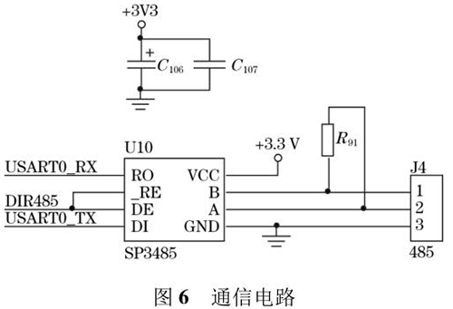 電鍍污水計量表輸出的流量值可以通過外接的 TFTLCD 屏直接顯示,還可以通過預(yù)留的 RS485 通信接口將數(shù)據(jù)發(fā)送到上位機(jī)中。RS485 電路*大的優(yōu)點(diǎn)是 485 電平與 TTL 電平兼容,方便與 TTL 電路相連;抗共模干擾能力強(qiáng);數(shù)據(jù)傳輸速度快,高達(dá) 10 Mbps;通信距離遠(yuǎn),*大為 1.2 km。系統(tǒng)采用 SP3485 芯片進(jìn)行數(shù)據(jù)通信,SP3485 是一款低功耗芯片且符合RS485 協(xié)議的收發(fā)器,電路圖如圖 6 所示。