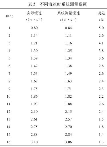 由表 2 測量數(shù)據(jù)可知,系統(tǒng)在測量低流速液體時(流速小于 1 m/s)誤差較大,達(dá)到 5%,當(dāng)待測液體的流速增大時(大于 1.4 m/s),誤差逐漸減小,基本維持在 3%以內(nèi)。由此可見系統(tǒng)具有較高的檢測精度,尤其是當(dāng)管道中的液體流速較高時,系統(tǒng)的檢測誤差不超過 3%,達(dá)到了設(shè)計預(yù)期。
