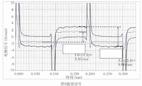 舉例,如圖5所示,線圈采用5Hz驅(qū)動(dòng)時(shí)的0feet/s,3.1feet/s,5.9feet/s流速下的電*信號(hào),利用上述方法對(duì)信號(hào)進(jìn)行處理并計(jì)算流速。取每半波*后的20%納入流速計(jì)算,正半波與負(fù)半波相減即是流速。如3.1feet/s–(-2.8feet/s)=5.9feet/s,雖然有+0.15 feet/s的直流偏置,但也不影響流速的計(jì)算。因線圈是5Hz驅(qū)動(dòng),半波的20%是20ms,正好是1個(gè)完整的工頻周期,這樣就不受工頻干擾的影響。正半波與負(fù)半波相減,這樣就避免了直流偏置和共模干擾的影響。再加上在數(shù)字濾波過程中使用限幅濾波和算數(shù)平均,保證了流量信號(hào)的有效提取。