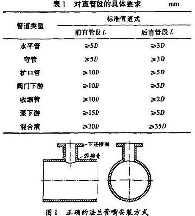 流體在方向、管徑以及閥門(mén)開(kāi)度變化時(shí),會(huì)產(chǎn)生渦流和流場(chǎng)畸變,這樣會(huì)對(duì)傳感器電*的測(cè)量產(chǎn)生影響,從而影響儀表的精度。所以要盡可能地離開(kāi)彎管、手閥、調(diào)節(jié)閥等部件一定距離,直管段的具體要求見(jiàn)表1。表中,D表示管道通徑,L表示傳感器到閥門(mén)或彎頭等部件的距離。