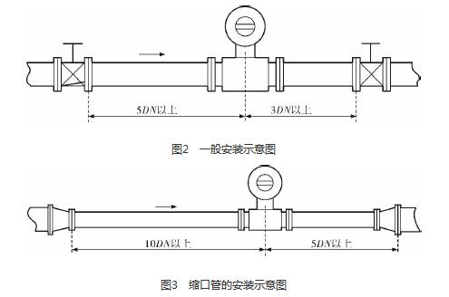 dn200污水流量計的安裝質(zhì)量對其測量結(jié)果的影響較大,因此在安裝時需要注意幾個問題。*先,dn200污水流量計直管段的選擇在配管時一定要按照要求進(jìn)行選擇,一般選擇流量計通徑與工藝管道通徑相同,即可滿足工程需要,而且安裝方便、壓力損失小,流量計直管段上游側(cè)的長度不少于5倍工藝管道直徑,下游側(cè)的長度不少于3倍工藝管道直徑(圖2)。但在流速太慢而又要求精度較高或需要變徑的應(yīng)用場合,可選擇通徑小于工藝管道通徑的流量計,以提高測量精度,此時流量計上、下游必須加裝異徑管,且進(jìn)口異徑管上游側(cè)應(yīng)有長于10倍工藝管道直徑的直管段,下游側(cè)應(yīng)有長于5倍工藝管道直徑的直管段(圖3)。