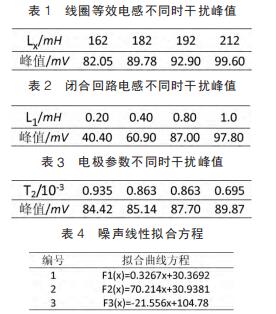 仿真試驗(yàn)中,設(shè)定線圈等效電感取值范圍為 162~212mH,間隔 10mH;閉合回路等效電感范圍 0.2~1mH,間隔為 0.2mH;雙電層電容、接觸電阻隨流體電導(dǎo)率變化而變化,電導(dǎo)率增大接觸電阻和雙電層電容減小而電荷傳遞電阻增大。可設(shè)定電*接觸電阻、雙電層電容和電荷傳遞電阻范圍分別為 5~15kΩ、10~20μF 和50~60Ω,由公式(7)知,可用 T2 表示上述三者關(guān)系。 仿真參數(shù)取值不同情況下,通過 MATLAB 工具箱對(duì)仿真測(cè)量得到的干擾峰值進(jìn)行曲線擬合畫出相應(yīng)的曲線圖。 其中仿真數(shù)據(jù)和相對(duì)應(yīng)的曲線方程如表 1~表 4 所示,曲線圖如圖 4~圖 6。