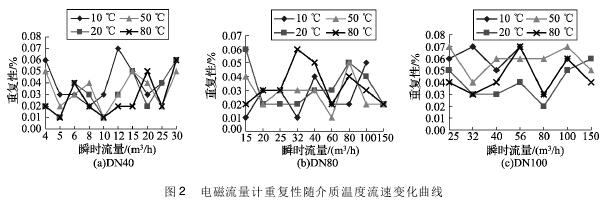 將實驗測得的粘土漿流量計在不同溫度及流速下的重復(fù)性數(shù)據(jù)整理,特性曲線如圖2所示,3組曲線分別對應(yīng)DN40、DN80、DN100的3塊粘土漿流量計的重復(fù)性曲線。