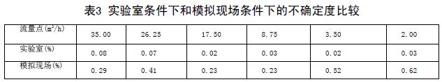 實(shí)驗(yàn)室條件下和模擬現(xiàn)場條件下的不確定度比較(表3)兩次結(jié)果可以看出,兩次實(shí)驗(yàn)各個流量點(diǎn)的不確定度差距非常大。可見,砂漿流量計(jì)對安裝條件還是比較苛刻的。