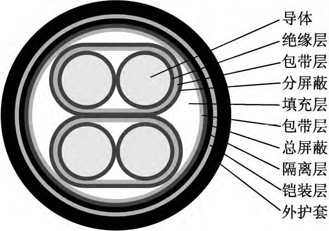 該新型電纜的結構如圖1所示。導體為單股退火鍍錫軟銅線,以提高導體的導電性和防腐蝕性。在導體外繞包一層薄F4(聚四氟乙烯)半導電帶,有利于降低導體和絕緣之間的摩擦起電噪音。絕緣采用材料較為純凈、介電常數較小、具有一定彈性的聚丙烯絕緣級材料,并采用擠壓式擠出,減小絕緣層與導體的間隙。采用對絞組作為信號傳輸線,由于在兩根傳輸線上感應的電壓接近相等,減小了電壓差值,提高了信號傳輸穩(wěn)定性;對絞組由兩種不同顏色絕緣線芯組成,相鄰線對對絞節(jié)距應不大于100mm。對絞分屏蔽組(即對對絞組進行分屏蔽,每對對絞組外繞包兩層聚酯帶和一層厚0.04mm鋁塑復合帶繞包,內置一根7×0.26mm鍍錫銅絞線作引流線)有利于對不同對絞組之間信號串音的抑制和隔離。對絞分屏蔽組同心式絞合成纜,在對絞分屏蔽組間填充非吸濕性材料,以保證纜芯圓整。在成纜纜芯外繞包兩層聚酯帶,再采用鋁塑復合帶繞包,內置鍍錫銅線作引流線,以提高電纜電磁屏蔽能力。總屏蔽層外擠包隔離層(隔離護套),隔離層采用絕緣級低密度聚乙烯材料。隔離層外采用鎧裝層,鎧裝材料為高導磁合金鋼帶,其為強磁材料,可將外來的磁通大部分限制在鎧裝層的外表面上(僅有少部分能進入被屏蔽的空間);鎧裝時對高導磁合金鋼帶采用縱包焊接,確保其形成一連續(xù)圓柱管;鎧裝層可提高電纜抗電磁干擾水平以及對電纜進行加強,減少電纜振動引起的電動勢。外護套采用藍色軟PVC(聚氯乙烯)護層級電纜材料擠包,實現電纜防護。